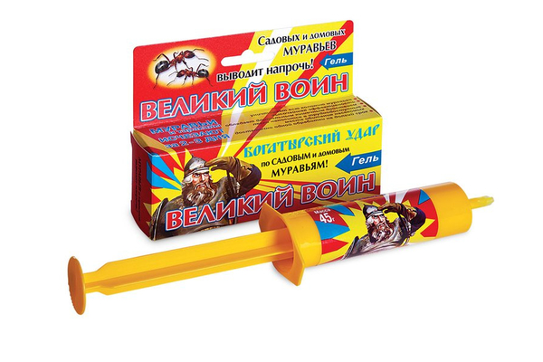 «Великий воин гель» против садовых и домашних муравьев. Уничтожает всю колонию муравьев. Высочайшая эффективность. Обладает длительным кишечным действием. Легко наносится в труднодоступные места обитания насекомых. Достаточно одной обработки на долгий срок. Состав: диазинон — 0,2%, хлорпирифос — 0,3%, стабилизатор, консервант, гелеобразователь, битрекс и пищевые наполнители — до 100%