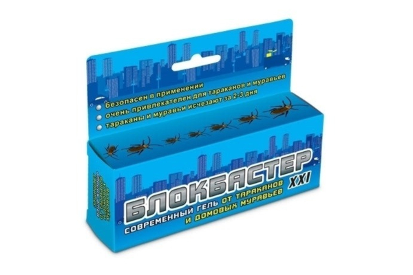 Гель уже через 2-3 дня полностью истребляет всех тараканов. Гель обладает ""каскадным"" эффектом.Входящие в его состав привлекатели заставляют тараканов предпочитать эту приманку любой другой пище.Гель ""Блокбастер"" не портится, не высыхает и не теряет своей эффективности очень долгое время. Гель удобен в применении, легко наносится в труднодоступные места.Не имеет неприятного запаха, не выделяет в воздух вредных веществ и может применяться людьми, страдающими аллергией и астмой.