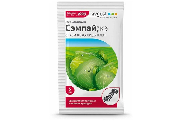 Благодаря улучшенной препаративной форме, содержащей прилипатель, Сэмпай надежно удерживается на листьях обработанных растений, при этом период его защитного действия составляет не менее 2-х недель. Кроме яблонь Сэмпай пригодится на капусте в борьбе с гусеницами белянок, совок и моли